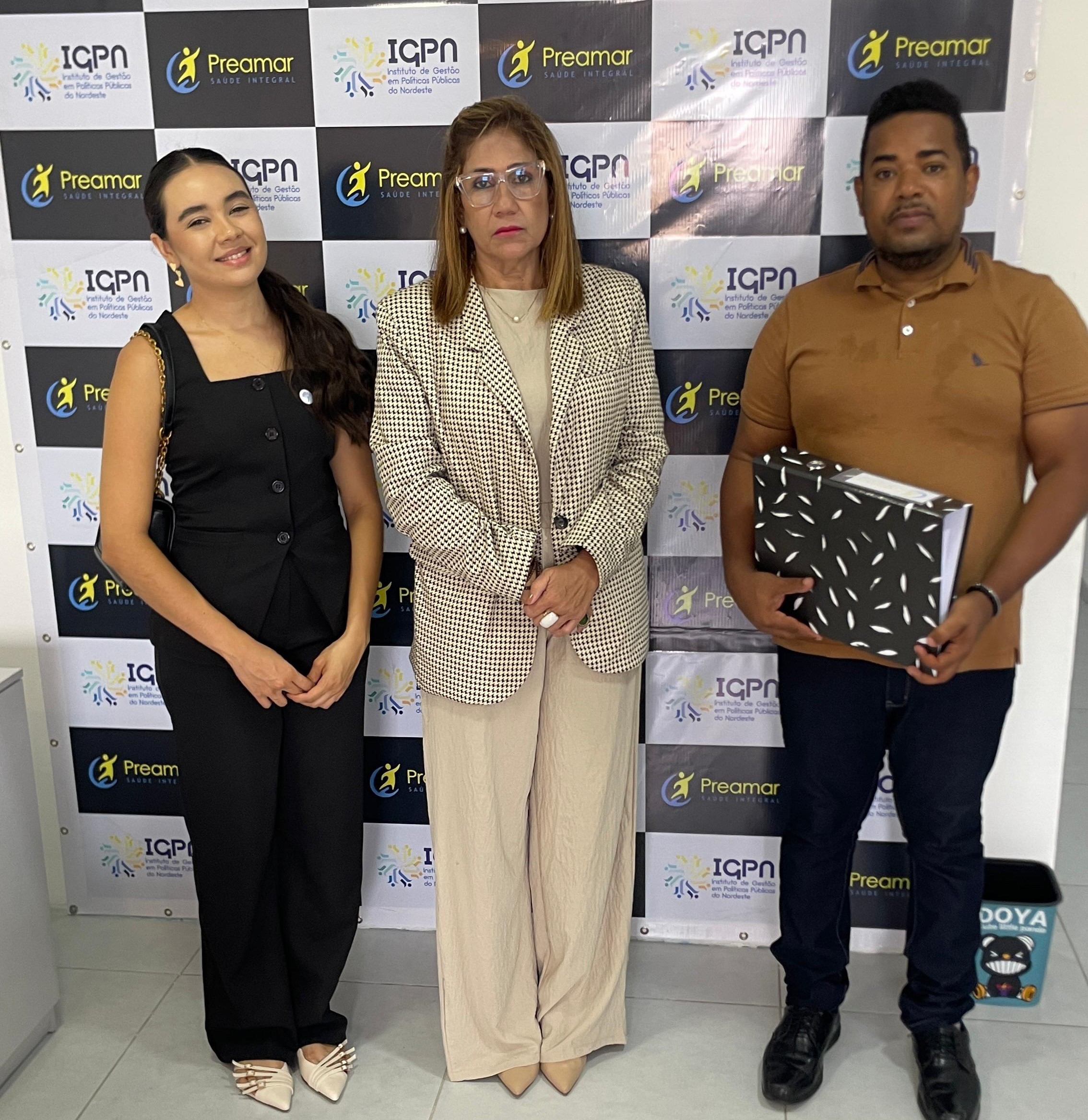 Drª. Edjane Monteiro, Presidente do Instituto Rede Vhida o coordenador administrativo do projeto PREAMAR Israel Vicente de Lima, e a Aux. Jurídica Anne Caroline Fonseca Nascimento durante visita técnica à filial do IGPN em Ipojuca-PE.